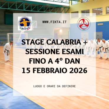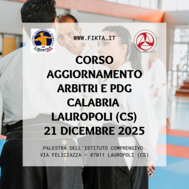 EVENTI 14 Dicembre 2025Tutto il giorno STAGE CALABRIA + SESSIONE ESAMI FINO A 4° DAN – 14 DICEMBRE 2025 SPOSTATO AL 15 FEBBRAIO 2026 Scopri di più 21 Dicembre 2025Inizio alle 09:00 CORSO AGGIORNAMENTO ARBITRI E PDG CALABRIA – LAUROPOLI (CS) – 21 DICEMBRE 2025 Scopri di più 15 Febbraio 2026Tutto il giorno STAGE REGIONALE CALABRIA – 15 FEBBRAIO 2026 Scopri di più 15 Febbraio 2026Inizio alle 09:00 STAGE CALABRIA + SESSIONE ESAMI FINO A 4° DAN – 15 FEBBRAIO 2026 Scopri di più 10 Maggio 2026Tutto il giorno CORSO AGGIORNAMENTO ARBITRI E PDG + CSAK CALABRIA – LAUROPOLI (CS) – 10 MAGGIO 2026 Scopri di più 14 Giugno 2026Tutto il giorno STAGE CALABRIA + SESSIONE ESAMI FINO A 4° DAN – 14 GIUGNO 2026 Scopri di più 29 Novembre 2026Inizio alle 09:00 CORSO AGGIORNAMENTO ARBITRI E PDG CALABRIA – LAUROPOLI (CS) – 29 NOVEMBRE 2026 Scopri di più Vedi tutti gli eventi CIRCOLARI
