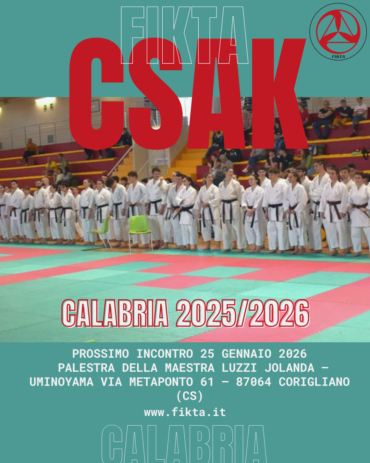 EVENTI 25 Gennaio 2026Inizio alle 09:00 PARTENZA CORSO CSAK CALABRIA 2025/2026 – CORIGLIANO (CS) – PROSSIMO INCONTRO 25 GENNAIO 2026 Scopri di più 15 Febbraio 2026Inizio alle 09:00 STAGE CALABRIA + SESSIONE ESAMI FINO A 4° DAN – 15 FEBBRAIO 2026 Scopri di più 10 Maggio 2026Tutto il giorno CORSO AGGIORNAMENTO ARBITRI E PDG + CSAK CALABRIA – LAUROPOLI (CS) – 10 MAGGIO 2026 Scopri di più 14 Giugno 2026Tutto il giorno STAGE CALABRIA + SESSIONE ESAMI FINO A 4° DAN – 14 GIUGNO 2026 Scopri di più 29 Novembre 2026Inizio alle 09:00 CORSO AGGIORNAMENTO ARBITRI E PDG CALABRIA – LAUROPOLI (CS) – 29 NOVEMBRE 2026 Scopri di più Vedi tutti gli eventi CIRCOLARI