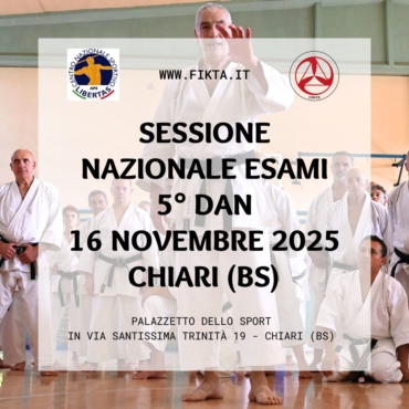15 Novembre 2025Inizio alle 14:30 PARTENZA CORSO CSAK PUGLIA 2025/2026 – PROSSIMO INCONTRO 15 NOVEMBRE 2025 – TARANTO (TA) PALESTRA OKINAWA Scopri di più 15 Novembre 2025Inizio alle 14:45 STAGE SARDEGNA + ESAMI FINO A 4° DAN – THIESI (SS) – 15 NOVEMBRE 2025 Scopri di più 16 Novembre 2025Inizio alle 08:00 STAGE LOMBARDIA + ESAMI FINO A 4° DAN – 16 NOVEMBRE 2025 Scopri di più 16 Novembre 2025Inizio alle 11:30 SESSIONE NAZIONALE ESAMI 5° DAN – 16 NOVEMBRE 2025 – CHIARI (BS) Scopri di più 22 Novembre 2025Inizio alle 08:30 STAGE NAZIONALE FIKTA M° KAWAWADA e FUGAZZA – PALASPORT FIDENZA (PR) – 22 NOVEMBRE 2025 Scopri di più 23 Novembre 2025Inizio alle 08:30 1° TROFEO PIEMONTE/VALLE D’AOSTA/LIGURIA – PALAZZETTO LE CUPOLE TORINO – 23 NOVEMBRE 2025 Scopri di più Vedi tutti gli eventi