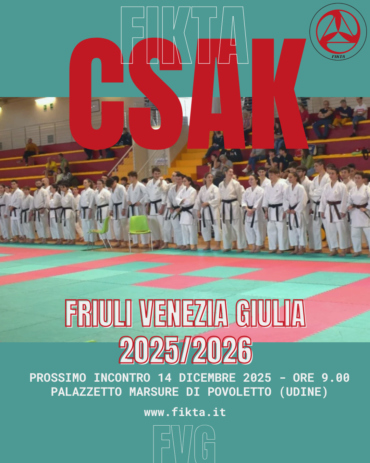 7 Dicembre 2025Inizio alle 12:30 56a COPPA SHOTOKAN HIROSHI SHIRAI – BASSANO DEL GRAPPA (VI) – 7 DICEMBRE 2025 Scopri di più 13 Dicembre 2025Inizio alle 08:30 STAGE TOSCANA + ESAMI FINO A 4° DAN – PIEVE A NIEVOLE (PT) – 13 DICEMBRE 2025 Scopri di più 13 Dicembre 2025Inizio alle 14:30 STAGE LAZIO + SESSIONE ESAMI FINO A 3° DAN – 13 DICEMBRE 2025 Scopri di più 13 Dicembre 2025Inizio alle 14:30 STAGE EMILIA + ESAMI FINO A 4° DAN – SAN PIETRO IN CASALE (BO) – 13 DICEMBRE 2025 Scopri di più 14 Dicembre 2025Tutto il giorno STAGE CALABRIA + SESSIONE ESAMI FINO A 4° DAN – 14 DICEMBRE 2025 SPOSTATO AL 15 FEBBRAIO 2026 Scopri di più 14 Dicembre 2025Inizio alle 09:00 CORSO CSAK FRIULI VENZIA GIULIA – MARSURE DI POVOLETTO (UD) – 14 DICEMBRE 2025 Scopri di più Vedi tutti gli eventi