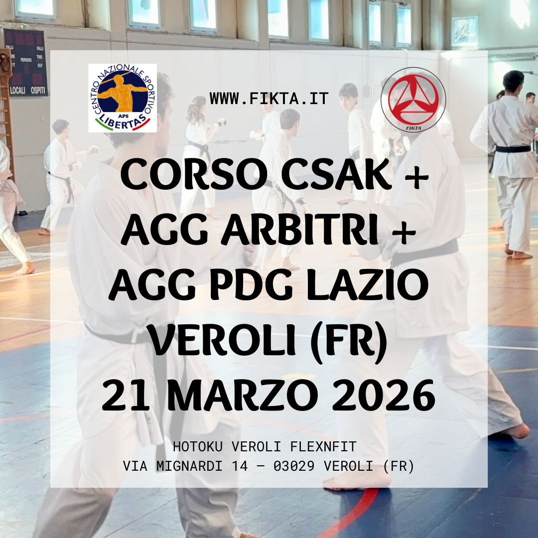 Palestra Scuola Secondaria 1° Grado "J. Pirona" - Via Europa rientranza di via Locanda 33040 Marsure di Povoletto (UD) Via Europa rientranza di via Locanda, Marsure di Povoletto (UD), ItalyCORSO CSAK 2025/2026 FRIULI VENEZIA GIULIA – MARSURE DI POVOLETTO (UD) – 18 GENNAIO 2026 Abbiamo il piacere di segnalare che i prossimi allenamenti del corso CSAK Friuli Venezia Giulia si terranno DATA / ORA / LOCALITA’ INCONTRI 18 gennaio…