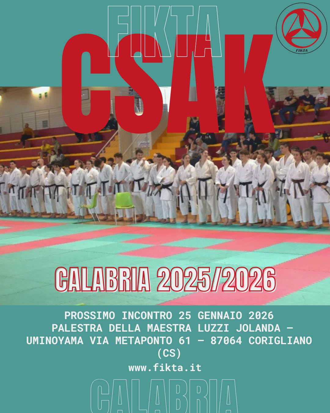 PARTENZA CORSO CSAK CALABRIA 2025/2026 - PROSSIMO INCONTRO 25 GENNAIO 2026 - CORIGLIANO (CS) Abbiamo il piacere di segnalare che è stato attivato il Corso Specialistico Agonisti Karate CSAK – Fikta della regione CALABRIA per l’anno 2025/2026. Il prossimo…