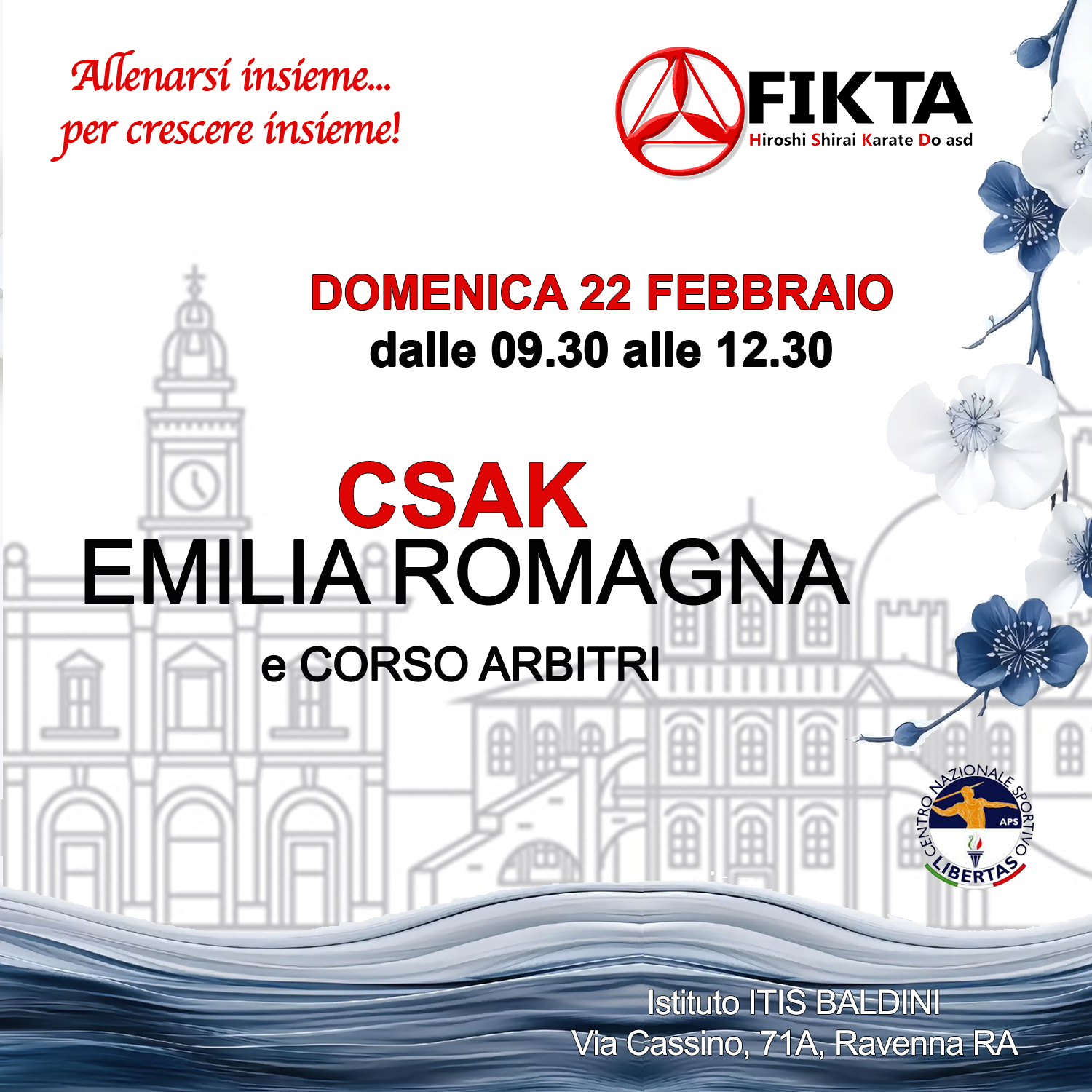CSAK + CORSO ARBITRI EMILIA ROMAGNA 2026 - RAVENNA - 22 FEBBRAIO 2026 Informiamo che il prossimo incontro CSAK Emilia Romagna 2026 si terrà il giorno 22 febbraio 2026 presso la palestra dell'Istituto ITIS Baldini di Via Cassino…