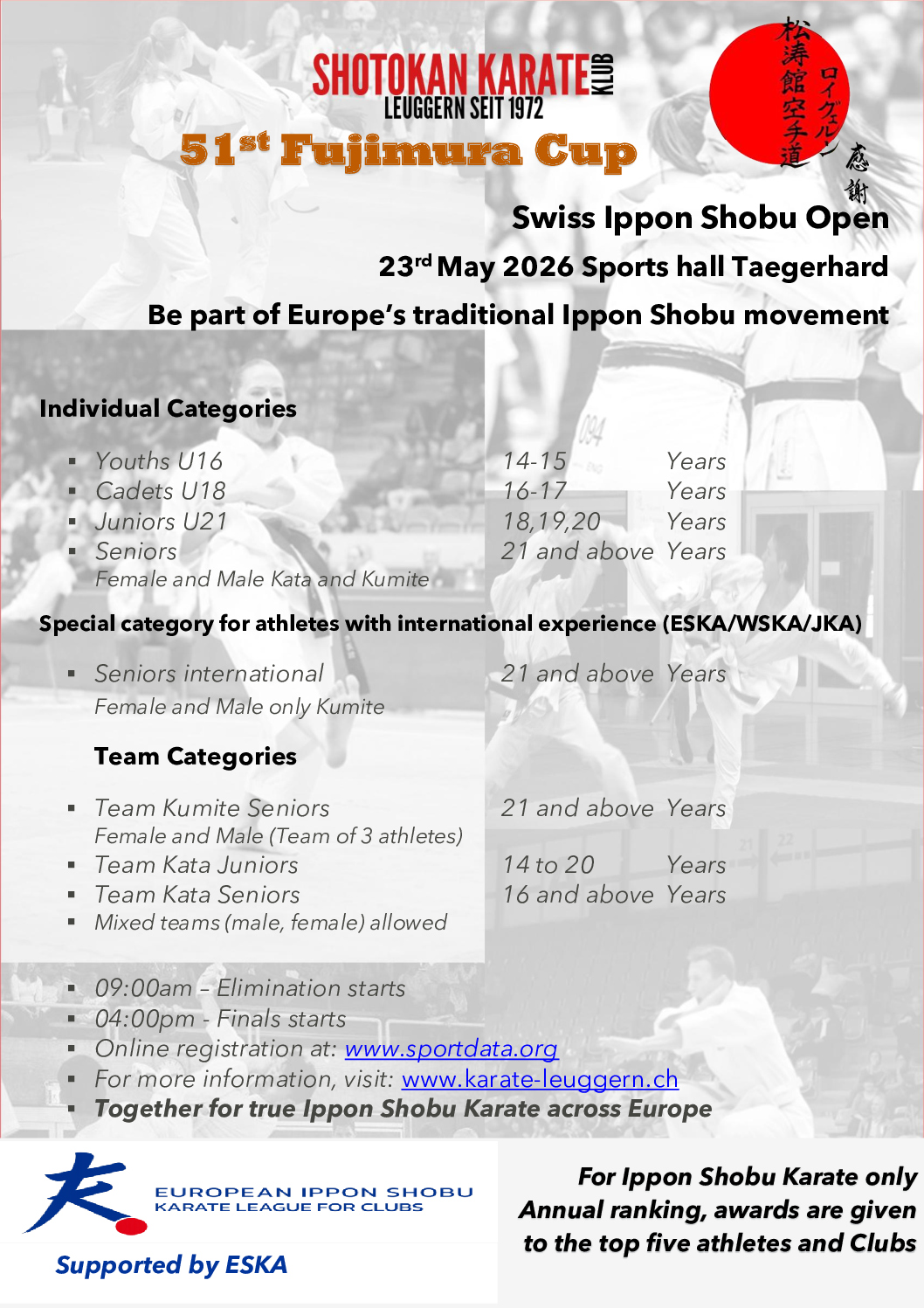 Abbiamo il piacere di comunicare che Fikta parteciperà con una propria rappresentativa alla 51° Fujimura Cup che si terrà a Wettingen – Sport Hall Taegerhard – Tägerhardstrasse 122, 5430 Wettingen, Svizzera il giorno 23 maggio 2026 dalle 8,00 alle 18,00.