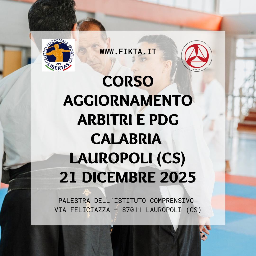 Segnaliamo che il prossimo 21 dicembre 2025 si terrà il Corso di aggiornamento Ufficiali di Gara 2025/2026 (Arbitri e Presidenti di Giuria) della regione Calabria presso presso la palestra dell’Istituto Comprensivo via Feliciazza – 87011 Lauropoli (CS).