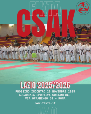 EVENTI 29 Novembre 2025Inizio alle 14:30 PARTENZA CORSO CSAK LAZIO 2025/2026 – PROSSIMO INCONTRO 29 NOVEMBRE 2025 – ACCADEMIA COSTANTINI LABARO (RM) Scopri di più 13 Dicembre 2025Inizio alle 14:30 STAGE LAZIO + SESSIONE ESAMI FINO A 3° DAN – 13 DICEMBRE 2025 Scopri di più 21 Dicembre 2025Tutto il giorno COMPETIZIONE 1a KIDS CUP LAZIO – 21 DICEMBRE 2025 Scopri di più 12 Dicembre 2026Tutto il giorno STAGE LAZIO + ESAMI FINO A 4° DAN – 12 DICEMBRE 2026 Scopri di più Vedi tutti gli eventi CIRCOLARI